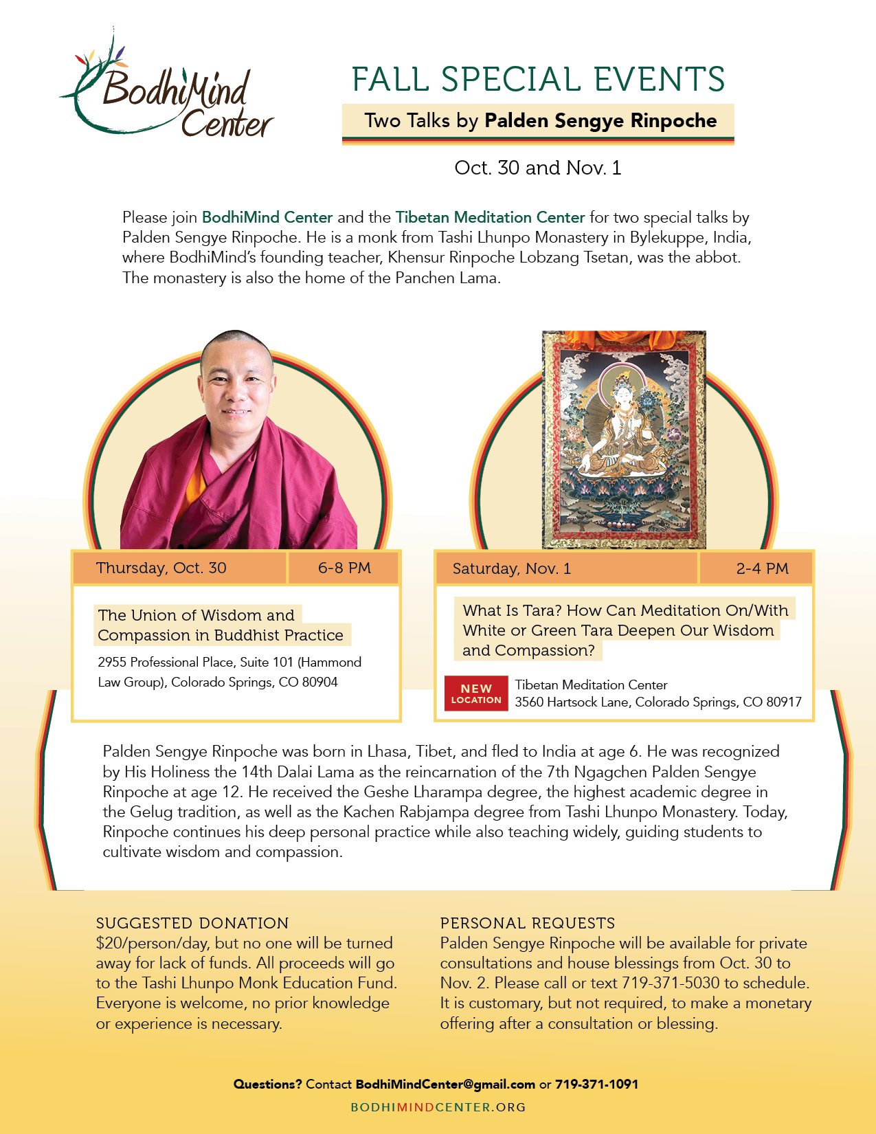 We hosted a wonderful Tibetan monk for teachings in October at our weekly space at 2955 Professional Place AND at the Tibetan Meditation Center at 3560 Hartsock Lane, Colorado Springs. See the information below.